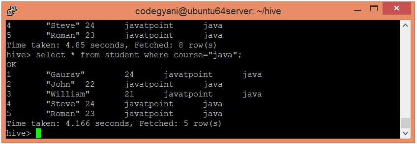 - hive> load data local inpath ‘/home/codegyani/hive/student_details2’ into table student