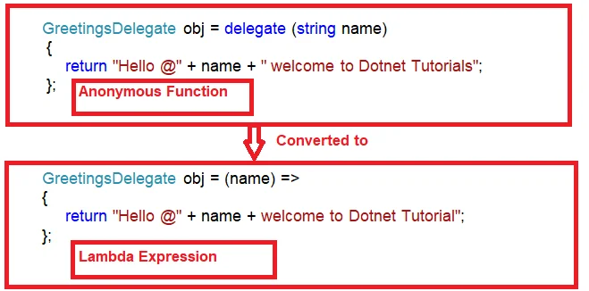 - A lambda expression is composed as a boundary list, trailed by the => (named as “goes into”) image, trailed by an expression or an assertion block. Lambda expression is composed, as displayed beneath.