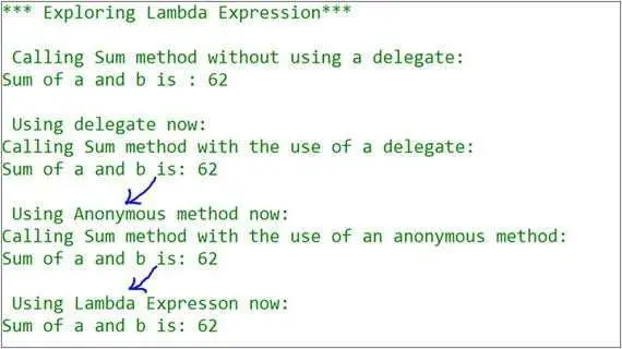 Anonymous strategies and lambda expressions give a method for utilizing inline code. They will decrease the lines of code and are helpful where a strategy is being utilized just a single time and the technique definition is short.