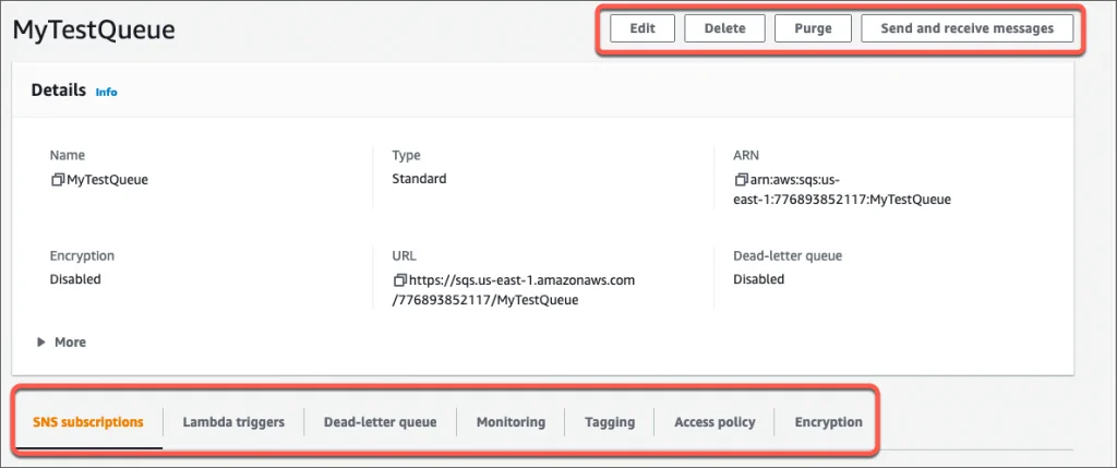 - You can also choose the queue name, which opens the small print page for the queue. the small print page includes equivalent actions because of the Queues page. additionally, you’ll choose one among the tabs below the small print section to look at additional configuration details and actions.