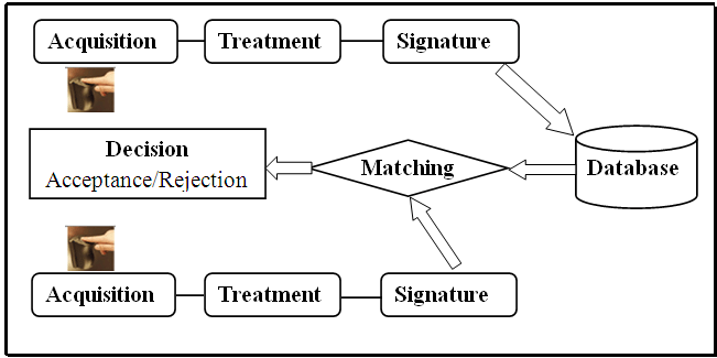 The biometric sample is acquired from the candidate user. The prominent features are extracted from the sample and it is then compared with all the samples stored in the database. When the input sample matches with one of the samples in the database, the biometric system allows the person to access the resources; otherwise prohibits.