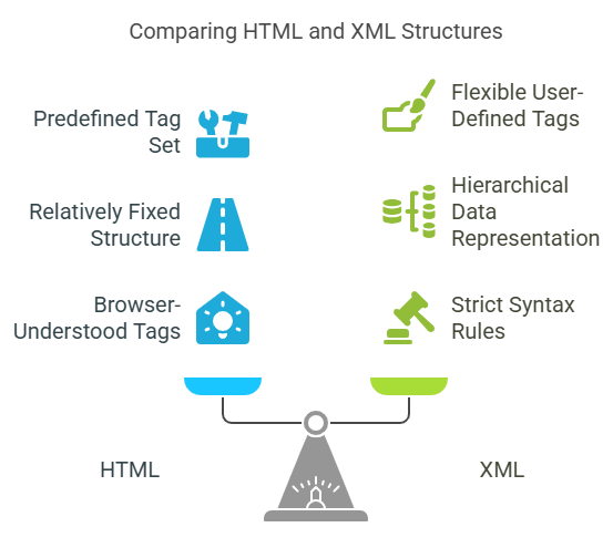 This strictness ensures that data in XML is reliable and unambiguous, which is critical for applications like data storage, configuration files, and web services. While HTML and XML share a similar syntax with tags and nested elements, their goals diverge: HTML is focused on presentation and user interface, whereas XML prioritizes data representation and transport. This complementary relationship often means XML is used behind the scenes in web applications to manage data, while HTML handles user-facing content. Understanding the differences between XML and HTML is essential for effectively designing web and data-driven systems.
