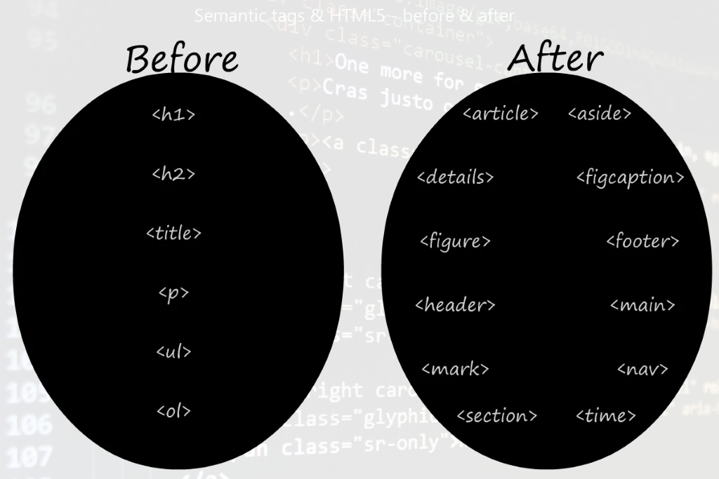 4. As the use of visually designed layouts progressed, programmers started to use a generic “non-semantic” tag like <'div>. They would often give these elements a class or id attribute to describe their purpose. For example, instead of <'header> this was often written as <'div class="header">.