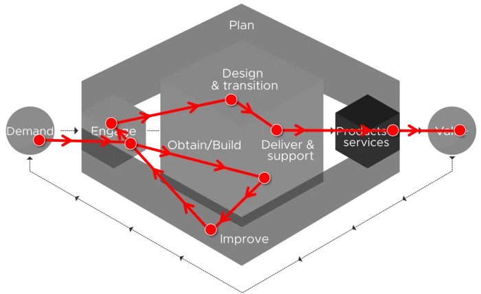 - The ITIL Service Value Chain portrays six key activities that can be combined according to various perspectives, outlining different worth streams. The Service Value Chain is sufficiently versatile to be acclimated to various systems, including DevOps and united IT, to address the prerequisite for different models of organization the leaders. The adaptability of the value tie engages relationship to react to changing solicitations from their accomplices in awesome and useful way. (Ref: ITIL4 book from AXELOS®)