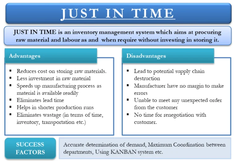 - In the nick of time producing goes connected at the hip with ideas like Kanban, persistent improvement, and all-out quality administration (TQM). In the nick of time creation requires complicated preparation as far as acquisition arrangements and the assembling system assuming its execution is to be a triumph.