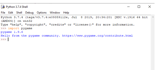 To check whether the pygame is properly installed or not, in the IDLE interpreter, type the following command and press Enter: