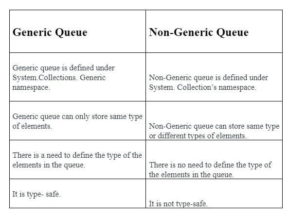 - Queue<'T> can contain components of the predefined type. It gives gather time type checking and doesn’t perform boxing-unpacking because it is nonexclusive.