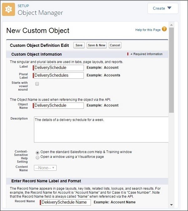 Now we fill in the details of the custom object we want to create. There are mandatory fields which should be filled before the object can be saved. In our case, we give the object a name called Delivery schedule and save it.