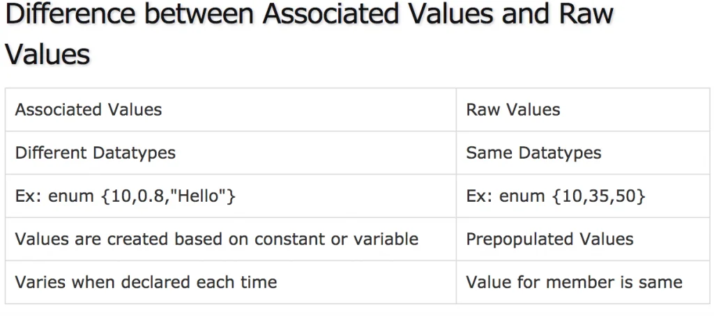 b) In swift enumeration s, we can store any sort of Associated qualities yet the worth kinds can be not quite the same as each instance of the list in light of our prerequisites.