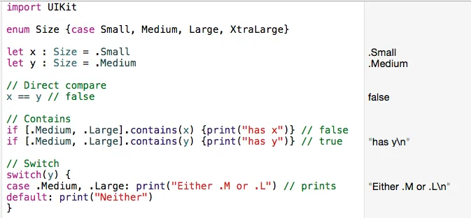 - The qualities anything, we characterized in swift enumeration can be a string or a person or a worth of whole number or float. We can make different sort of enumeration models in swift like an assortment of shadings, cards, creatures, and so on