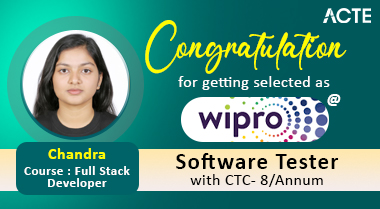 Hello, I am Chandra. I completed my Fullstack course at ACTE Technologies. From the moment I joined, I was impressed with the course structure and the practical exposure provided by the trainers. The trainers were professionals, offering real-world insights and guidance throughout. ACTE’s placement support helped me immensely, and soon after completing the course, I got placed as a Software Tester at Wipro. I want to extend my heartfelt thanks to ACTE Technologies for their valuable support and for helping me land my dream job.