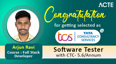 Hi all, This is Arjun Ravi, a Fullstack student from ACTE Technologies. My journey with ACTE has been a fantastic one! The course content was top-notch, and the trainers, all working professionals, shared their valuable real-time experiences. ACTE’s placement team was always supportive, helping me with interview preparation and guiding me throughout the placement process. I’m happy to announce that I have been placed as a Software Tester at TCS. I would like to thank ACTE Technologies for their excellent training and placement assistance.